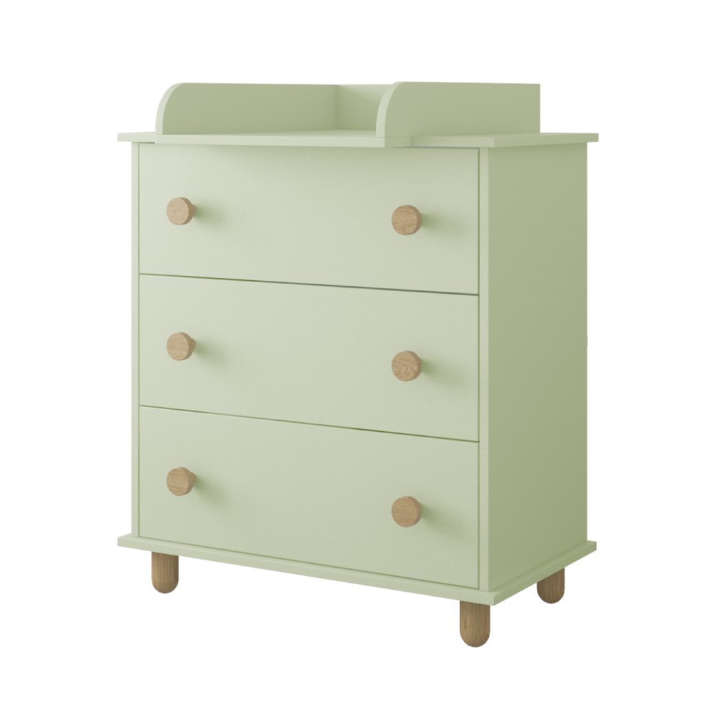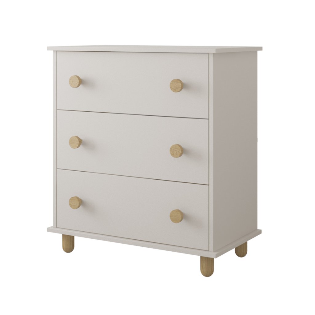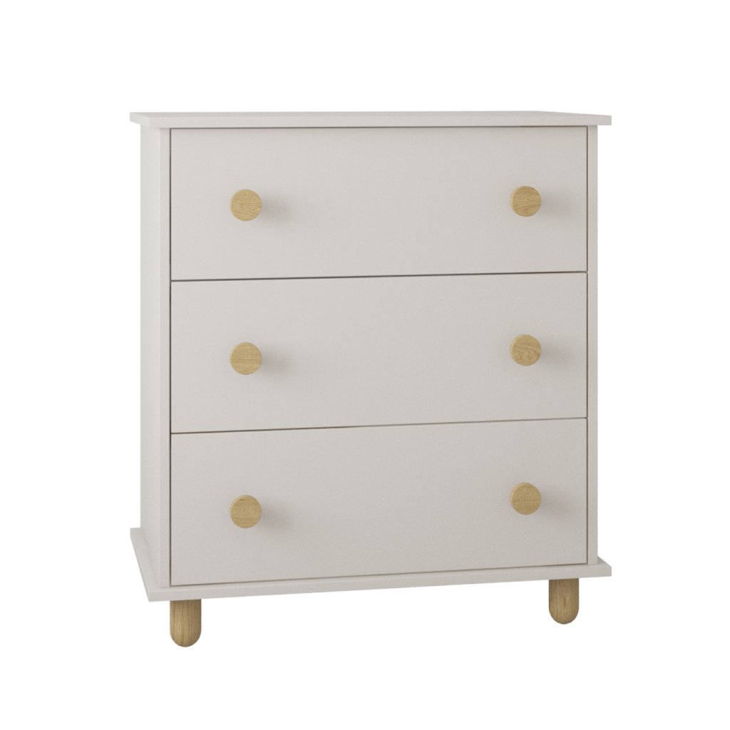 Komoda se třemi prostornými zásuvkami z kolekce LUMI spojuje jednoduchý skandinávský vzhled s praktičností pro každodenní použití. Komoda je k dispozici v čistě bílé, jemném kašmíru i svěží pastelové mátě, doplněná o přírodní bukové nožky a úchytky, díky čemuž působí lehce, vzdušně a snadno se sladí s dalším nábytkem v dětském pokoji.
