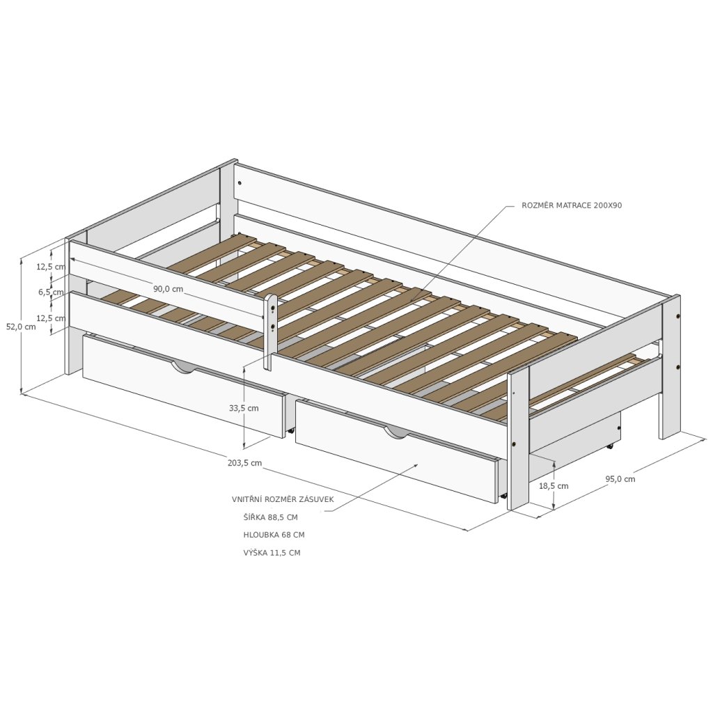 Spací plocha 200×90 cm poskytuje dostatek prostoru pro malé i větší děti. Postel roste s dítětem a je vhodná i pro období školního věku.