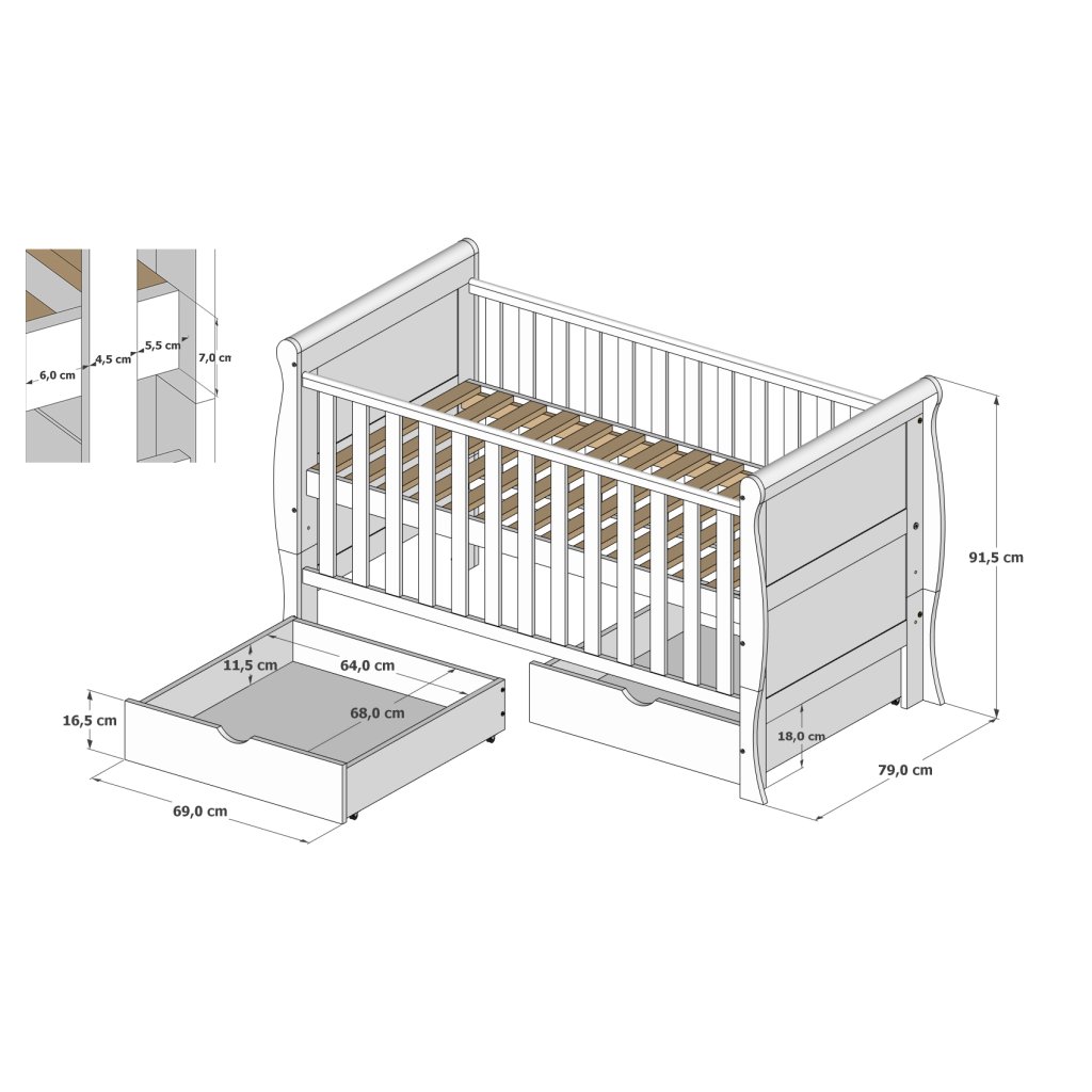 Postýlka SCARLET je vyrobena z kvalitní nábytkové desky a masivního borovicového dřeva s důrazem na bezpečnost, pohodlí a moderní vzhled. Splňuje přísné bezpečnostní normy a využívá pouze netoxické, přírodní materiály, které vytvářejí zdravé prostředí pro klidný spánek vašeho dítěte.