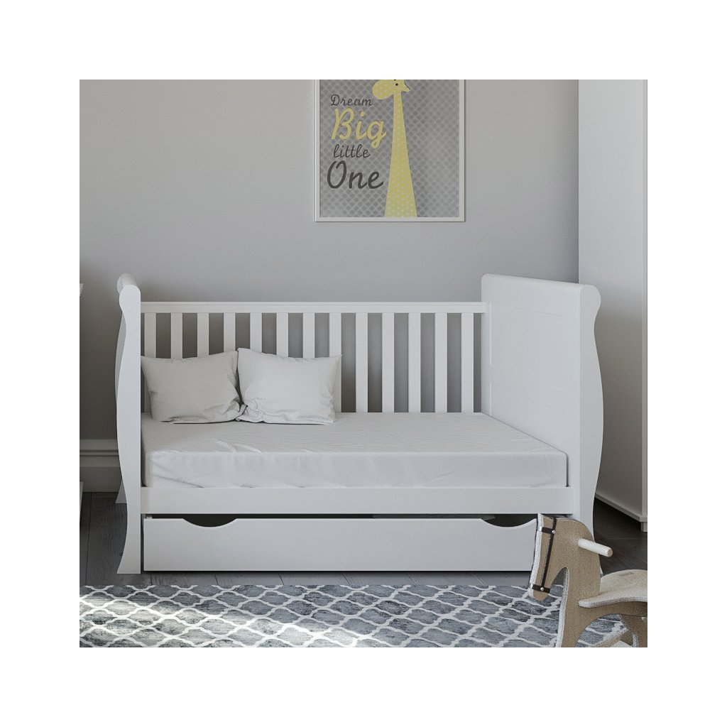 Úložný prostor není součástí balení, ale výrazně zvyšuje praktičnost postýlky a pomáhá udržet pokojíček uklizený.