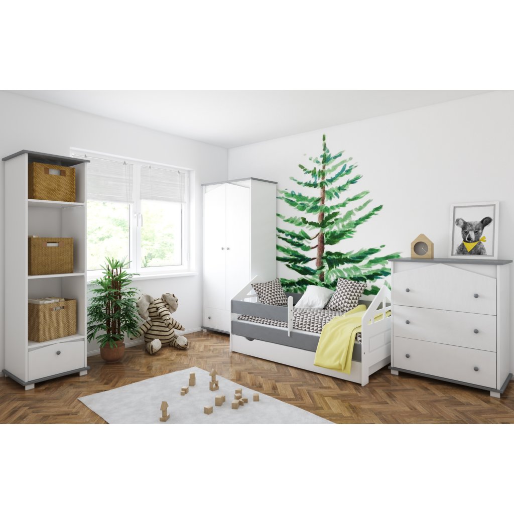 Nábytek připomíná silutetu domečku, která působí útulně a dodává pokoji pocit domova. Tento vizuálně poutavý motiv není jen krásný, ale také podporuje hravost, bezpečí a kreativitu.