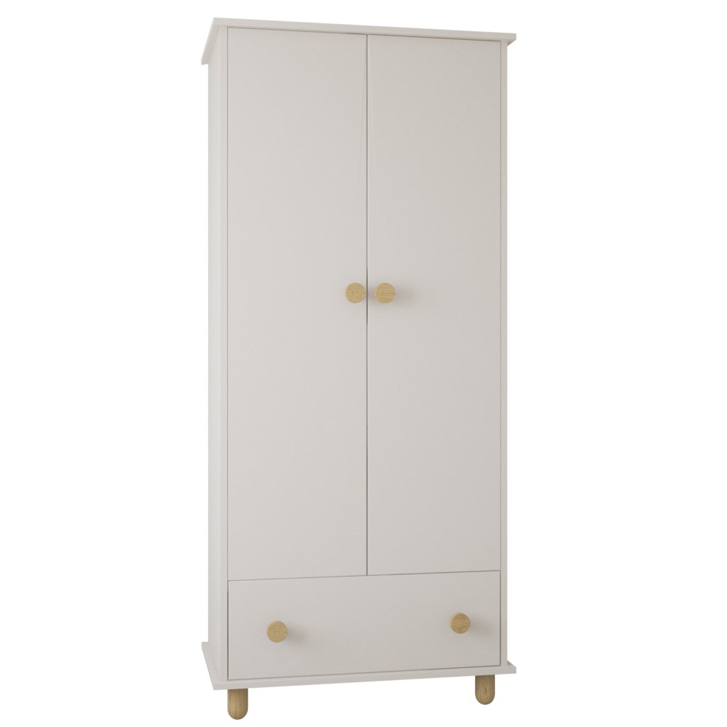 Elegantní bukové úchytky a nožky dodávají skříni jedinečný vzhled. Skříň je dostupná v bílé, jemném kašmíru i svěží pastelové mátě, díky čemuž krásně zapadne do moderního dětského pokoje se skandinávským nádechem.