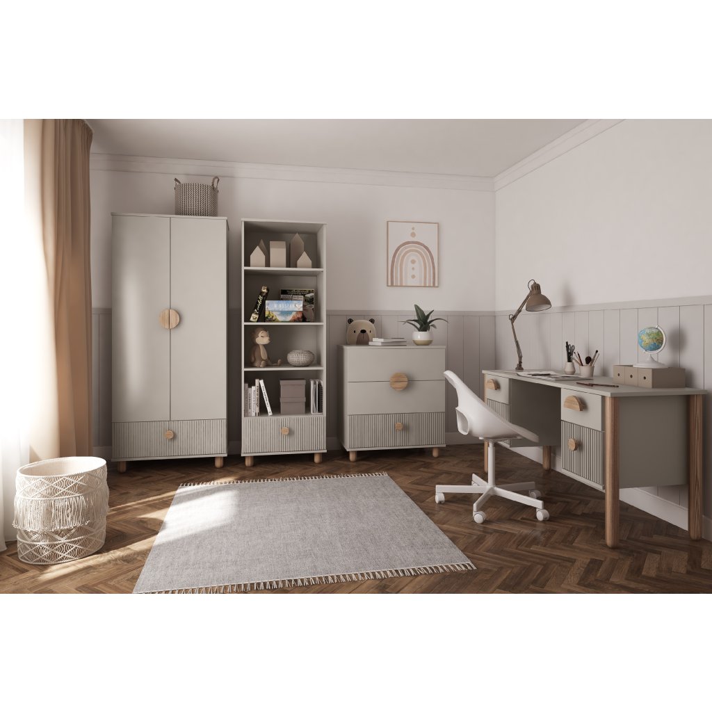 Dětská sestava LOFT propojuje moderní skandinávský design, přírodní detaily a praktičnost do harmonického celku. Nábytek je navržen s ohledem na každodenní provoz v dětském pokoji – je bezpečný, elegantní a snadno kombinovatelný. Bukové nožky a kulaté úchytky z masivního dřeva dodávají celé sestavě teplo a vizuální lehkost. Všechny prvky jsou vyrobeny z kvalitní laminované desky o síle 18 a 22 mm pro dlouhou životnost a stabilitu.