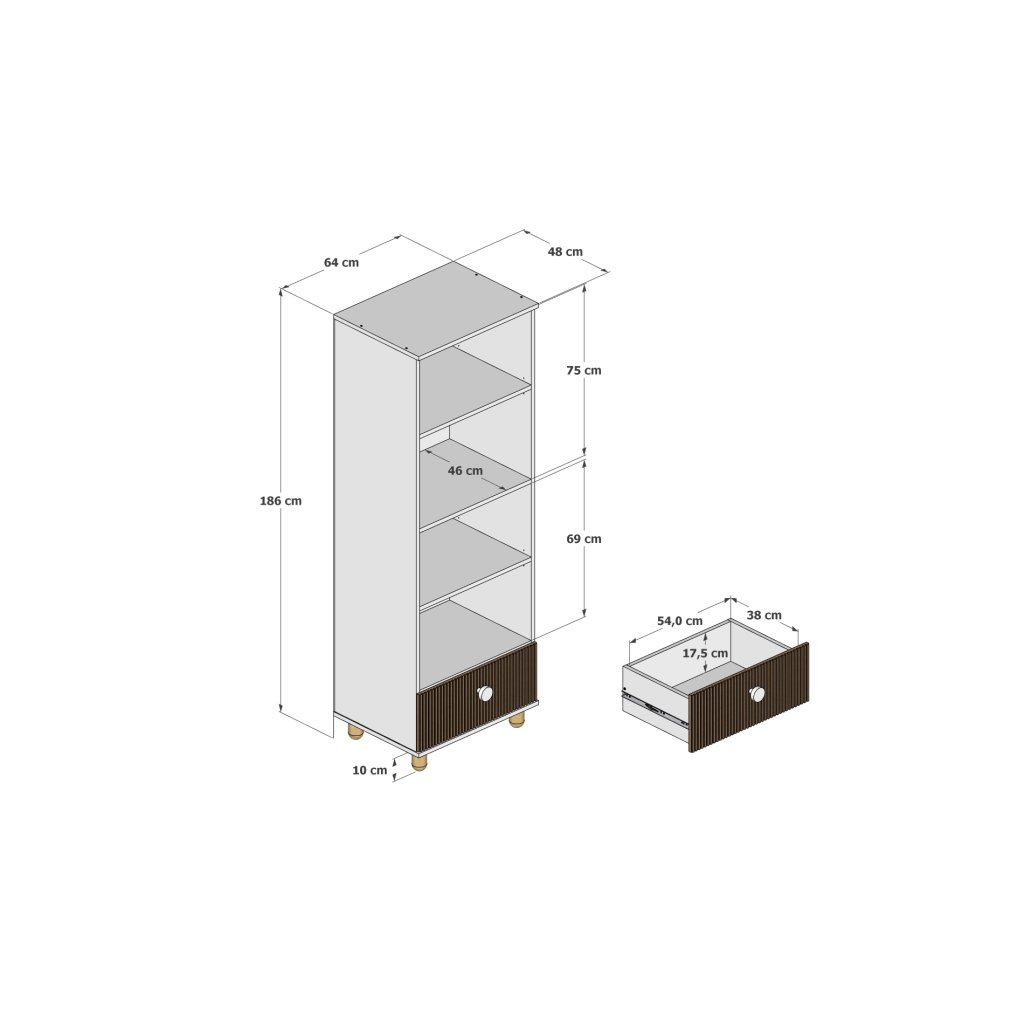 - Knihovna (regál) – se třemi prostornými policemi a zásuvkou